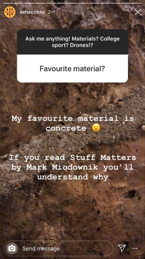 Unsurprisingly, like the perceptive undergraduate, concrete tops my favourite material list, but after listening to Miodownik’s book, carbon has shot up the rankings to 2nd. The world of diamonds, graphite and graphene sounds fascinating, but not as fascinating as concrete.