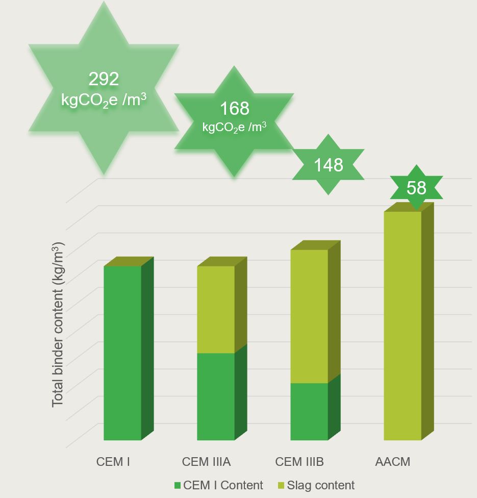 As illustrated in Table 2, the maximum CO2e emissions occur when 100% CEM I is used. However, as the percentage of slag content is increased (i.e. lower levels of carbon in the concrete), the level of global CO2 emissions increases (Figure 3). The use of low carbon concrete is actually increasing global CO2 emissions.