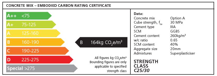 The drive to use low carbon concrete is gathering pace. New products are coming to market. Clients are demanding more sustainable projects. The proposed Lower Thames Crossing is leading the way in this aspiration, with National Highways designating it a ‘pathfinder’ project that will explore carbon neutral construction as part of its efforts to make the new crossing the greenest road ever built in the UK . Guidance on how to reduce carbon emissions in concrete has recently been published by ICE and the Green Construction Board , which includes a benchmarking system, similar to that found on domestic electrical appliances (Figure 1), which aims to encourage clients and engineers to reduce carbon contents.
