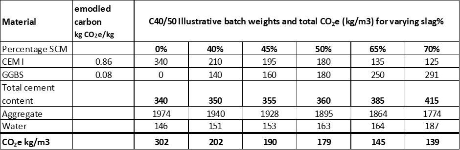 The analysis in Table 2 shows that the optimum level of slag addition for purely sustainability reasons is very low, providing this low amount is used in all concrete. In practice this is never going to occur and it would waste the undoubted performance benefits of slag in concrete but the general principle that lower slag contents will reduce global CO2e should be observed.