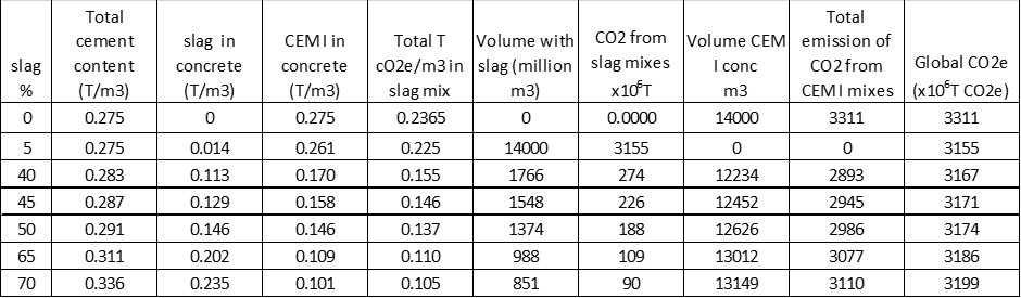 With 14 billion m3 of concrete produced annually and say 200mT of slag available we can theoretically add a meagre 14kg of slag to each cubic metre of concrete. At such a low addition rate, none of the performance advantages of slag would be realised. If we assume the average cement content for CEM I is 275kg/m3 then 14kg is only 5%, which is so ow that the material would still class as CEM I according to EN 196. If 40% slag was used, there would be a small increase in total cement content to maintain the characteristic strength at 28 days compared to a concrete made with 100% CEM I and there would be sufficient slag to produce 1766 million m3 while the remaining 12234 million m3 (see Table 2) would need to be produced with CEM I (as all the slag has been used). Using these volumes to calculate CO2e and just considering cement for simplicity, gives some interesting results.